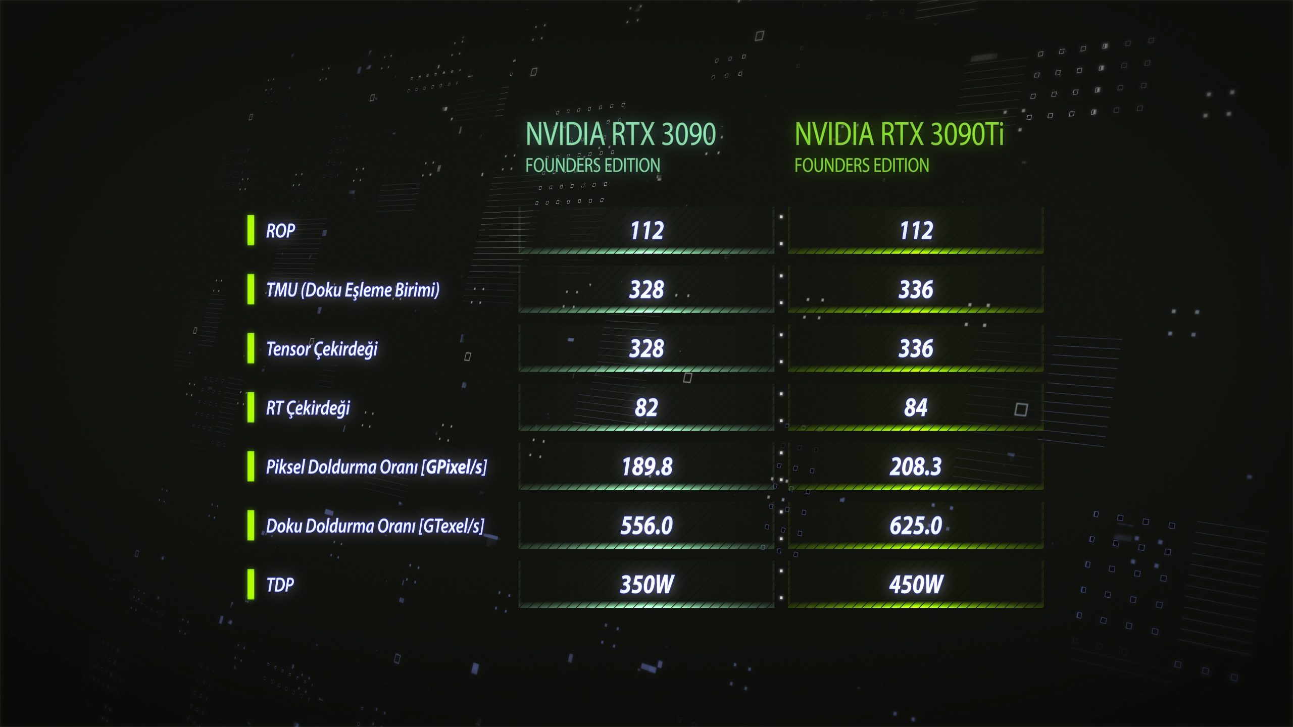 3090 Ti toplamda 10752 Cuda çekirdeği, 112 ROP, 336 doku eşleme birimi, 336 tensor çekirdeği ve 84 ışın işleme çekirdeğiyle geliyor. Bu 3090’a da güç veren GA102 silikonunun tüm özellikleri açılmış, en güçlü hali. Nvidia bu versiyonları üretimdeki verimlilik sorunları aşıldıktan sonra çıkarıyor genellikle ki 3090 Ti ile olan şey tam da bu.