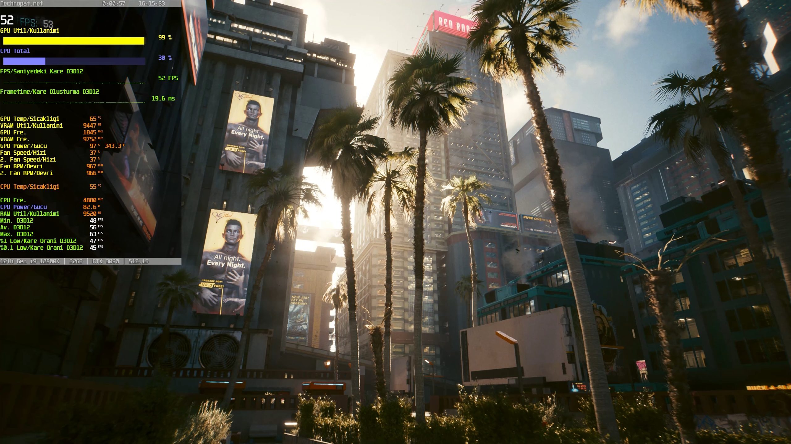 | Cyberpunk 2077 | Raytracing Ultra | 4K | 79 | 62 (+%8.77) | 44 | 51 | 48 | 67°C | 443W |