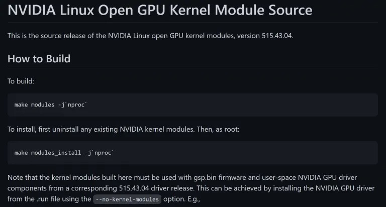 NVIDIA, R515 sürümünden başlayarak çift GPL/MIT lisansıyla açık kaynak olarak Linux GPU çekirdek modülleri yayınlamaya başladı. Bu çekirdek modüllerinin kaynak kodunu GitHub’daki NVIDIA Açık GPU Çekirdek Modülleri deposunda bulabilirsiniz.