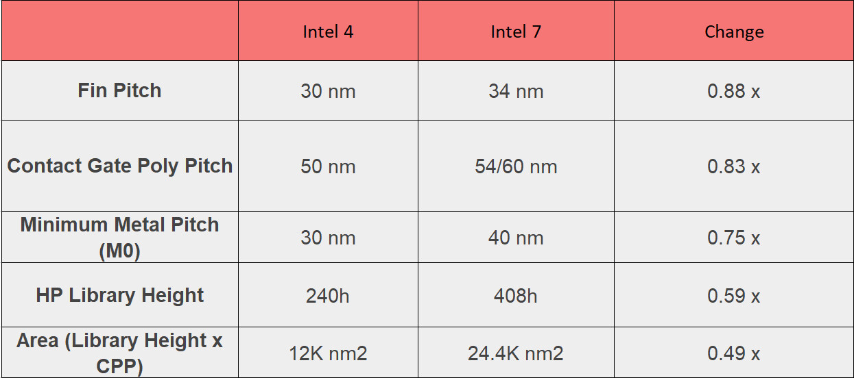 Bireysel transistör boyutuna bakıldığında Intel 4 teknolojisi oldukça küçük bir silikon parçasını temsil ediyor. 30nm Fin Pitch, kapılar arasında 50nm Contact Gate Poly Pitch ve 50nm Minimum Metal Pitch (M0) ile Intel 4 transistörü, tabloda listelenen Intel 7 hücresine kıyasla önemli ölçüde daha küçük. Ölçeklendirme açısından Intel 4, Intel 7’ye kıyasla aynı alanda iki kat daha fazla transistör sunabiliyor. Ancak bu bu sürecin farklı detayları var. Intel 7 üzerinde oluşturulan aynı SoC, Intel 4’ün yarısı kadar olmayacak. Intel 7 ile milimetre kareye 80 milyon transistör sığarken, Intel 4 ile bu miktar 160 milyona çıkabiliyor.