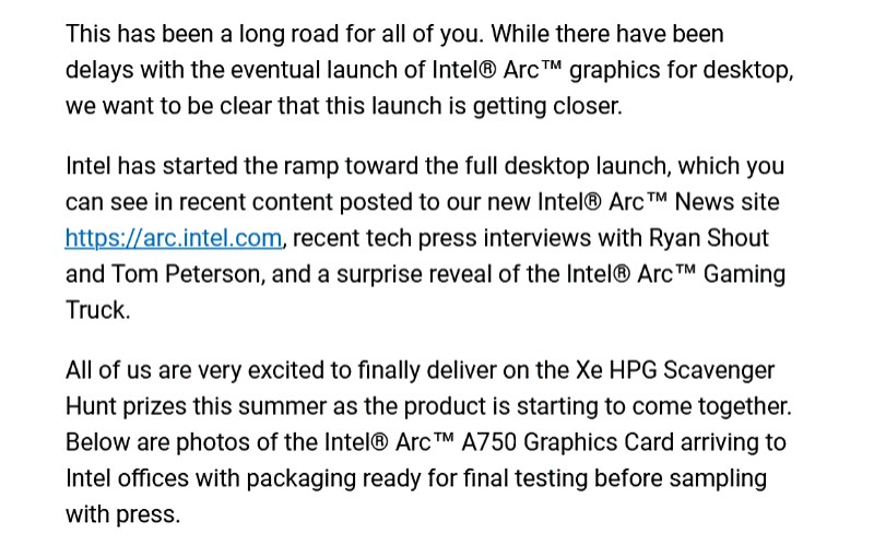 Öte yandan Intel, Arc masaüstü lansmanını etkileyen gecikmeleri de kabul etmiş görünüyor. Ancak merakla beklenen duyurular artık çok yaklaştı diyebiliriz. İlginç bir şekilde, şirket Arc A750 örneklemesinin yakında başlayacağını da onayladı. Ekran kartları Intel’e ulaştı ve şimdi çeşitli yayıncılara gönderilmeden önce test edilecek.