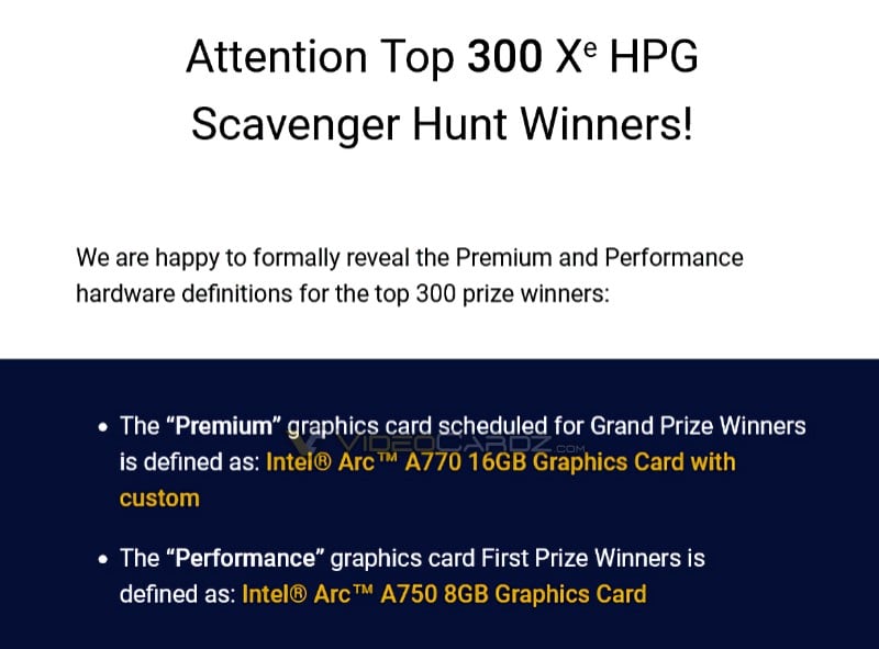 Intel, yeni ekran kartlarını tanıtmak amacıyla Arc Scavenger Hunt adında bir ödül etkinliği düzenlemişti. Xe-HPG Scavenger Hunt, hayranların Intel tarafından sosyal medya üzerinden yayınlanan içerikte gizli bilgileri bulma şansı bulduğu birkaç haftalık bir etkinlikti. Bu noktada 100 “Premium” ve 200 “Performance” olmak üzere çok sayıda ekran kartı ödül planlandı.