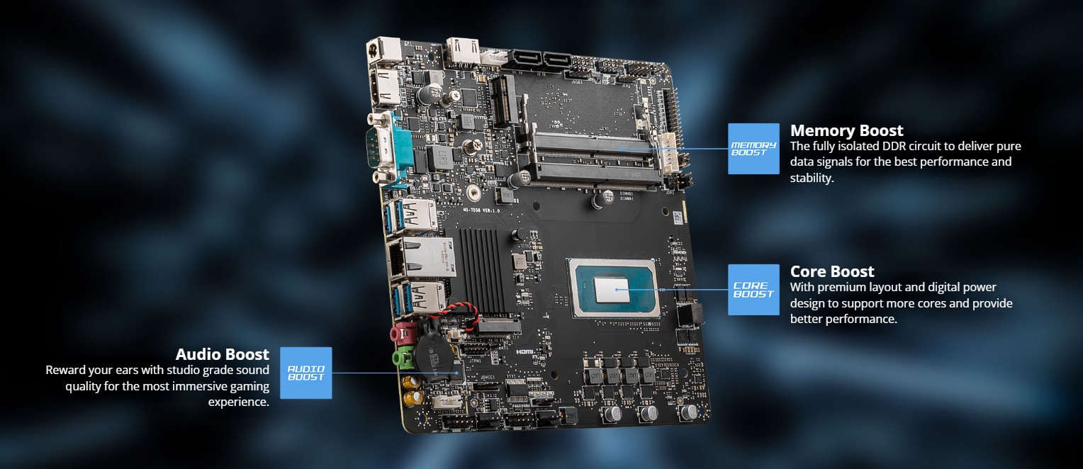 Yer verilen 6 çekirdekli Core i5 mobil işlemci, 4.4 GHz maksimum turbo frekansa çıkabiliyor ve maksimum yapılandırmada 45W TDP’ye ulaşıyor. Anakart, 64 GB’a kadar çift kanallı DDR4 3200 MHz bellek desteği ve depolama için iki SATA bağlantı noktasına sahip. PCB üzerinde yer alan M.2 yuvası yalnızca kablosuz eklenti kartları için kullanılabiliyor.