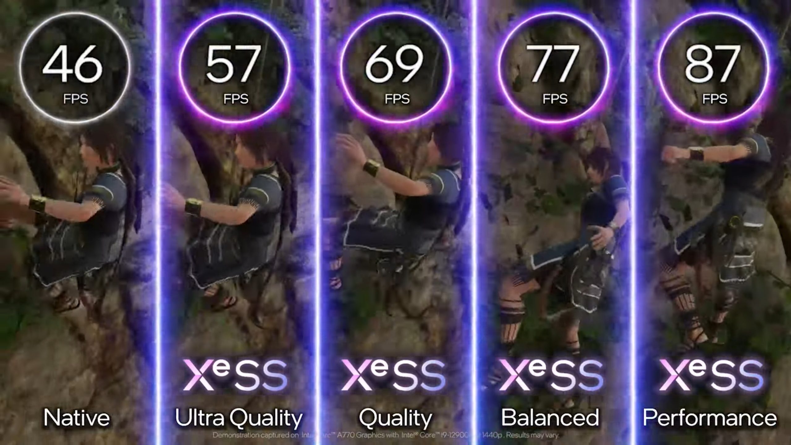 Xe Super Sampling dört kalite moduyla gelecek: Performans, Dengeli, Kalite ve Ultra-Kalite. Core i9-12900K işlemci ile birlikte hareket eden Arc A770, XeSS aktif değilken 46 FPS elde ediyor. XeSS teknolojisi devreye girdiğinde ise yapılan ayara göre kare hızları 87’ye kadar ulaşabiliyor.