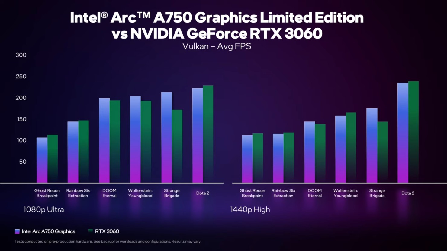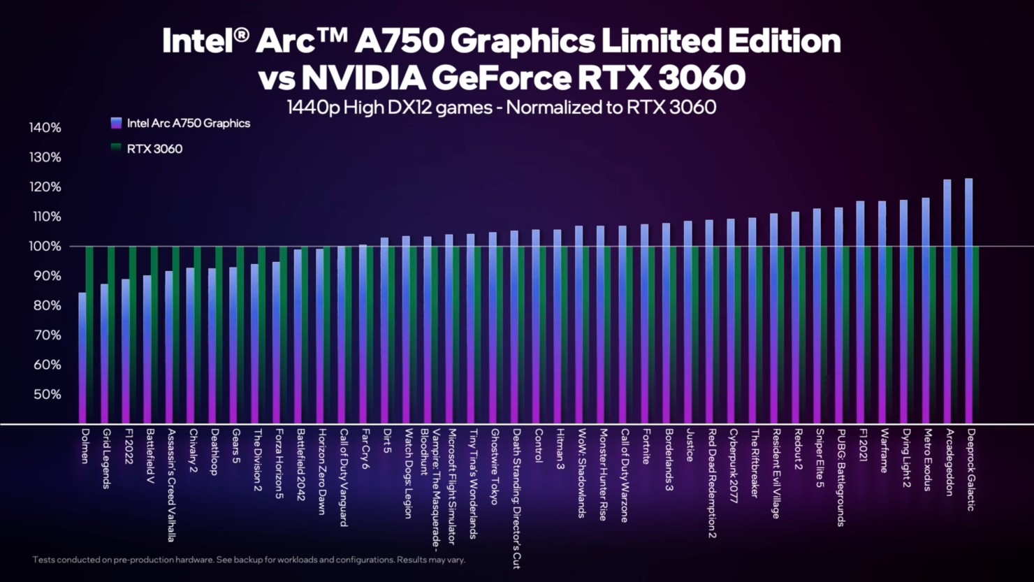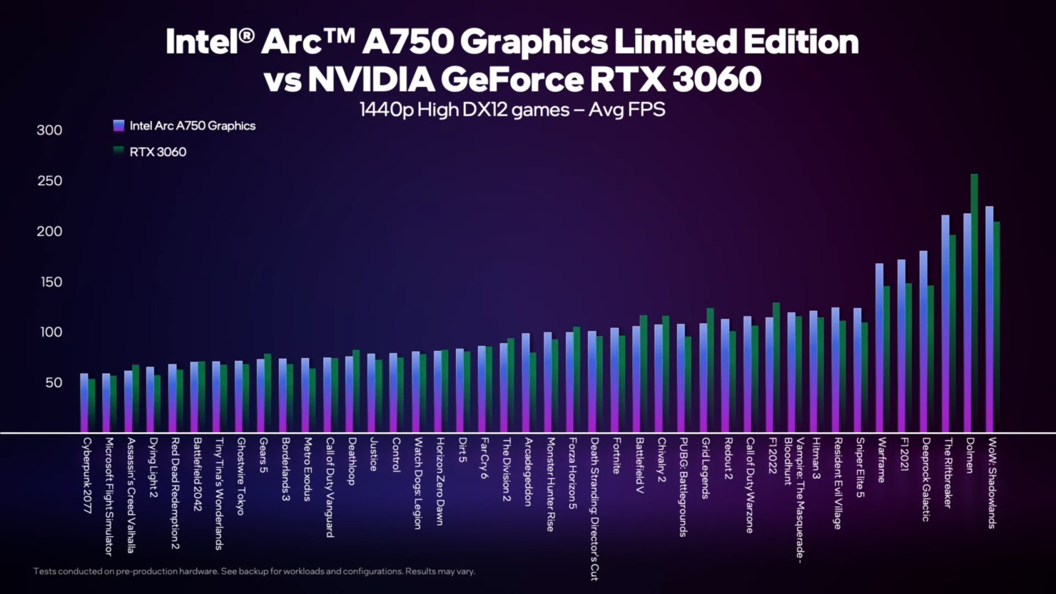 Arc A750 ve GeForce RTX 3060 ile 50 oyunda yapılan testlere bakacak olursak, Intel’in ekran kartı ortalama %5 daha performanslı. Mavi takım, muhteşem bir DirectX 12 ve Vulkan performansı sunacaklarını söylüyor. DirectX 11 ve daha eski oyunlar konusunda bazı sorunlar olduğunu biliyoruz, ancak şirket oyuncuların performanstan tatmin olacağını belirtmiş. Ek olarak, DirectX 9 destekli oyunlar için “D3D9On12” olarak bilinen açık kaynaklı bir emülatör kullanılacağını belirtmiştik. İşte Intel ile yapılan röportajdan satır başları: