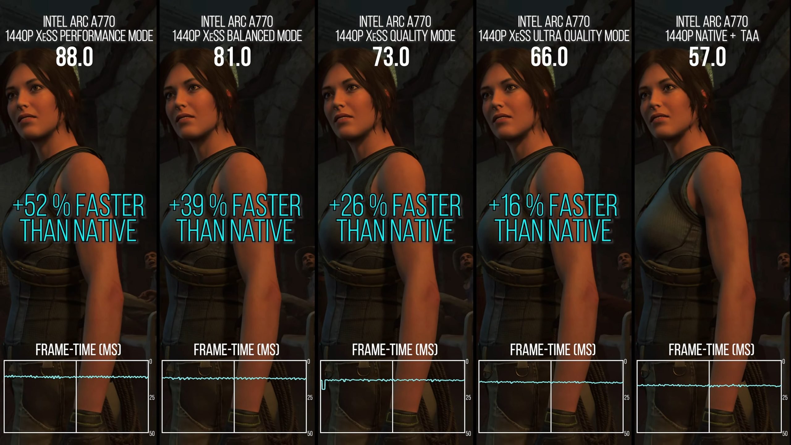 XeSS, Digital Foundry’ye göre FSR 2.0 ve DLSS 2.0’da bulunmayan bir Ultra Kalite moduna sahip olacak. Kalite Modunda daha yüksek çözünürlükler kullanılırken 4K ve 1440p çözünürlükte %16 ile %23 arasında performans artışı sağlanıyor. Diğer modların kalitesi ise mevcut sahnedeki grafiklerin çıktı çözünürlüğüne ve yoğunluğuna bağlı olacak. Oyuncular, Performans moduyla %88’e varan daha iyi FPS değeri elde edecek.