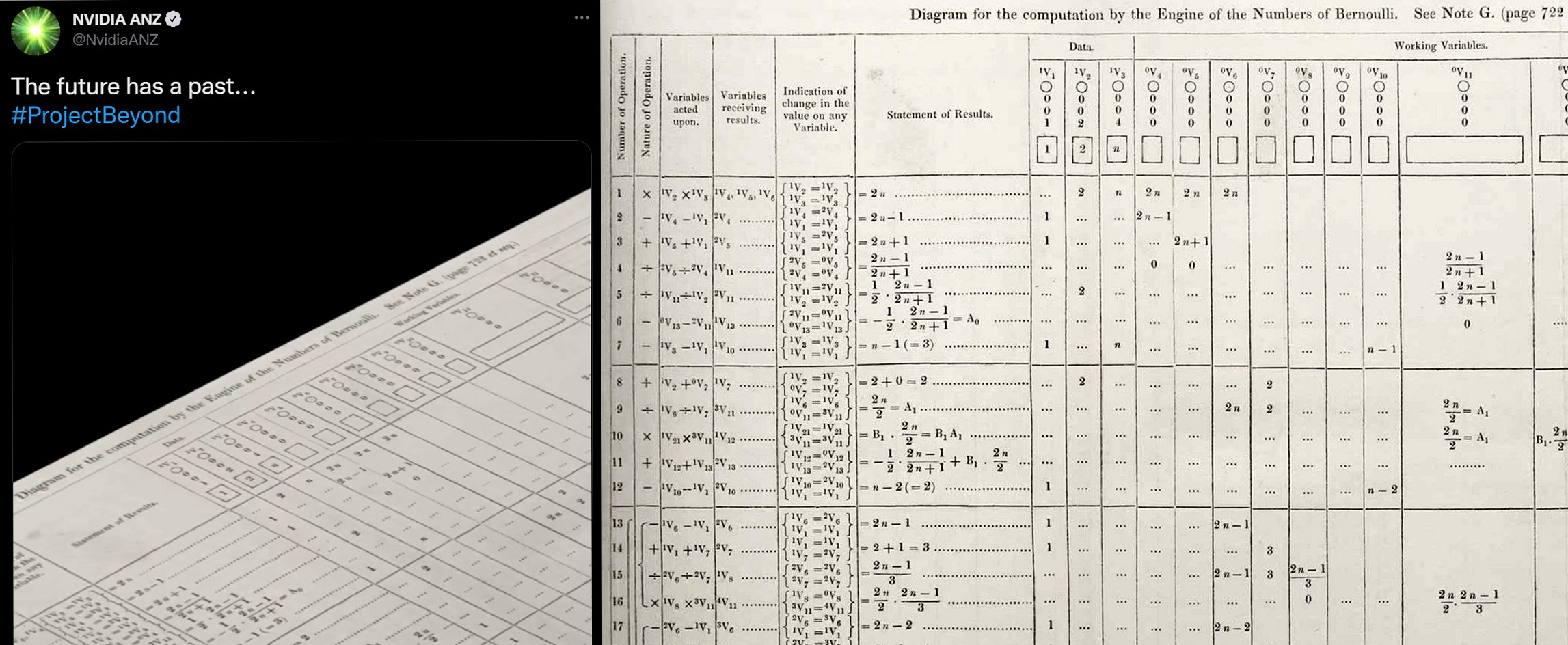 Videoda “Engine of the Numbers of Bernoulli tarafından hesaplanması için bir diyagram” yer alıyor. Bu çizelge 1843’te Ada Lovelace tarafından yapıldı. Charles Babbage’ın Analitik Motoru (Analytical Engine) için oluşturuldu ve ilk “önem arz eden” bilgisayar programı olarak kabul ediliyor. Böylelikle NVIDIA, Ada mimarisine dayalı RTX 4000 serisini duyuracağını dolaylı olarak da onaylamış oldu.