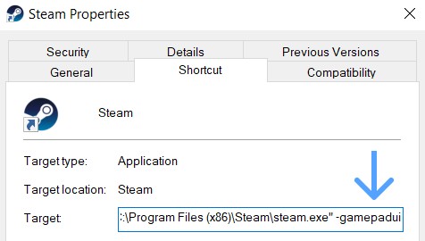 - Bu sayfadan ‘Hedef’ kısmının sonuna -gamepadui yazın ve Tamam’a basın.