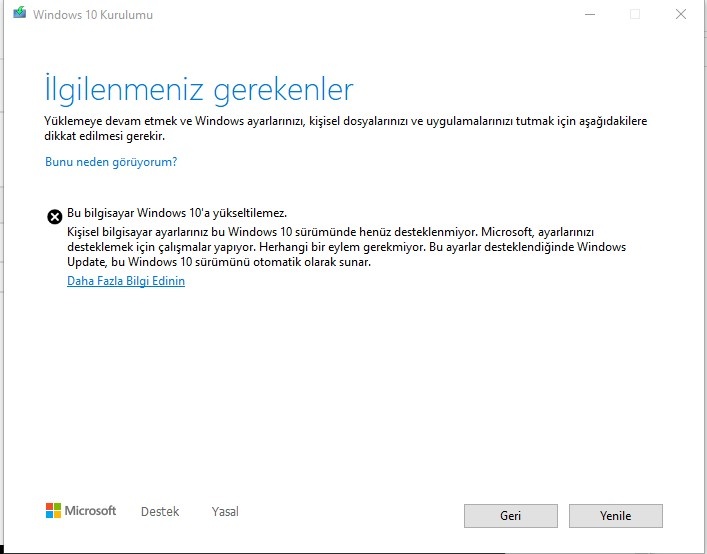 Windowsumu bu sürüme yükseltemiyorum.