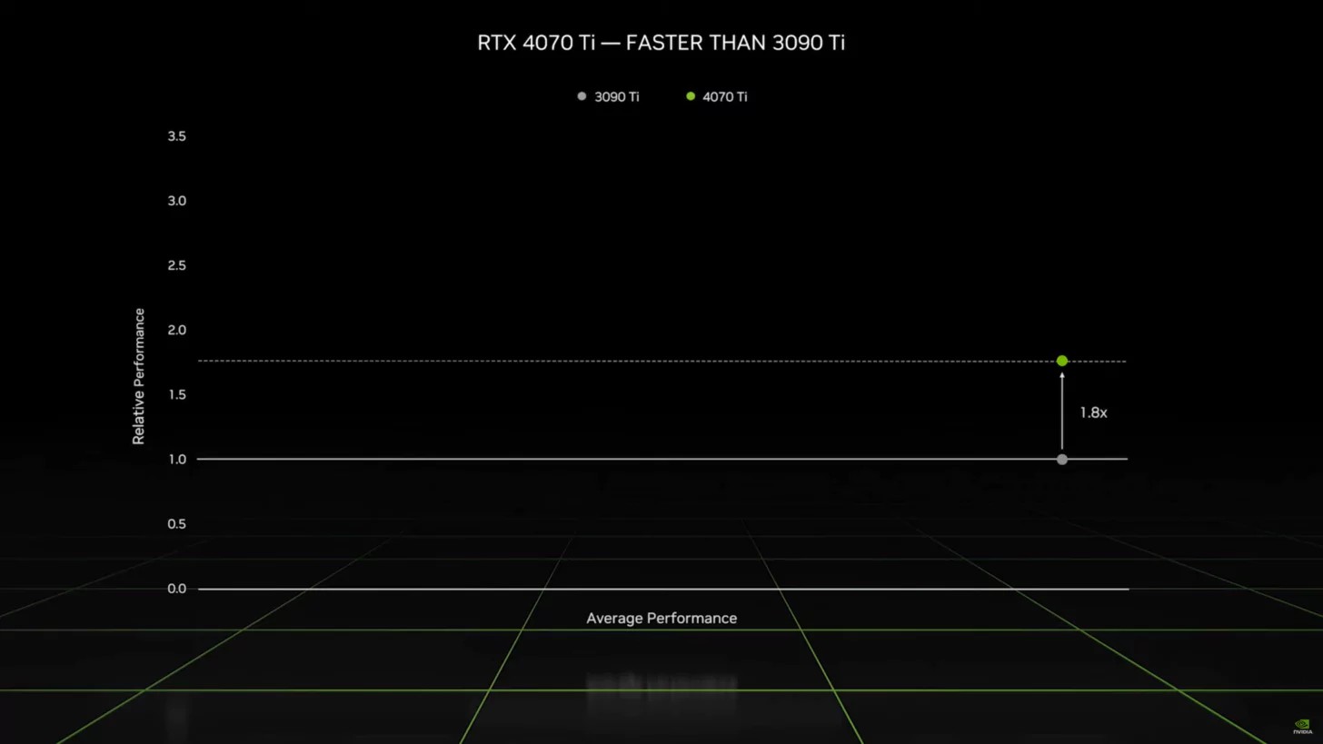 Performansa gelince, yeşil takım GeForce RTX 4070 Ti ekran kartını önceki nesil amiral gemisiyle kıyasladı. Yeni Ada GPU, sunumlara bakılırsa tüm oyunlarda daha önde. Ancak şirket testlerin hangi şartlar altında olduğunu belirtmiyor. Tahmin ediyoruz ki bu testlerde RTX ve DLSS 3 teknolojileri de kullanıldı. Çok yakında detaylı bir inceleme yapacağız. Bu nedenle performans rakamlarını merak ediyorsanız beklemede kalın.