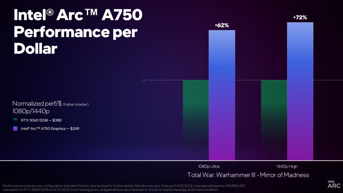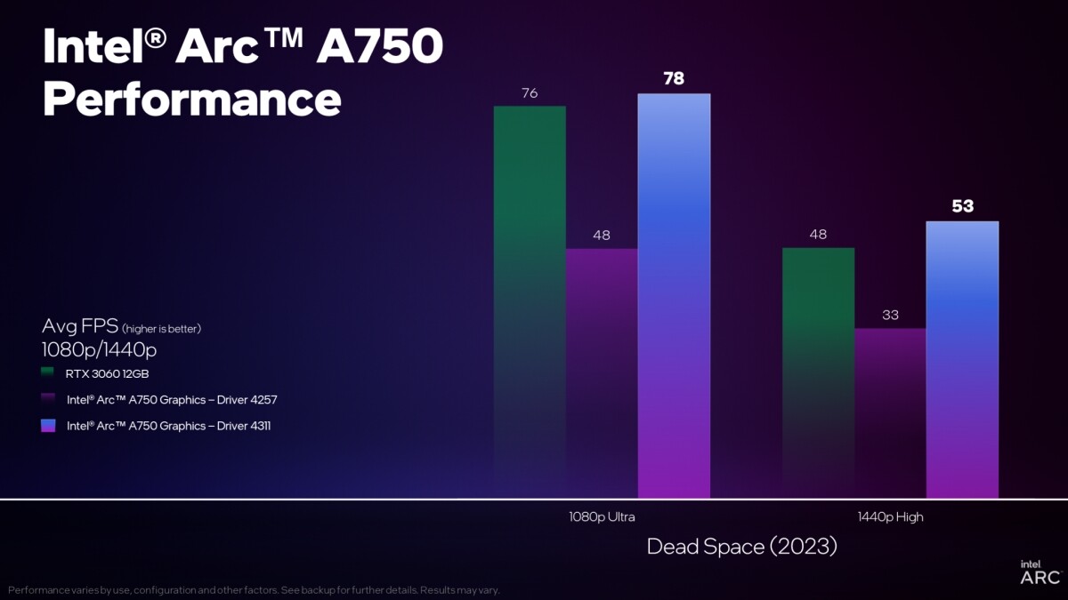 Güncel sürücü, çeşitli Game On optimizasyonlarının yanı sıra çoğunlukla Arc A750 ve DirectX 12’ye odaklanan, oyuna ve çözünürlüğe bağlı olarak yüzde 4 ila yüzde 63 arasında değişen bazı performans artışları getirdi. Arc A750 8 GB, RTX 3060 ise 12 GB GDDR6 bellekle geliyor. Ancak Arc A750 256 bit, rakibi RTX 3060 192 bitlik bellek arayüzüne sahip. Arc markalı kart bu sayede 512 GB/sn maksimum bellek bant genişliğine çıkabiliyor.