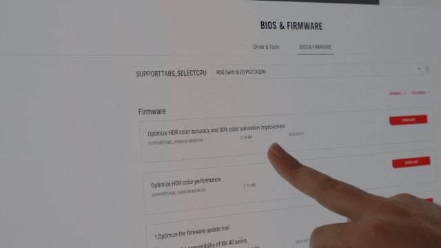 Asus ROG Swift OLED PG27AQDM ürününün sayfasına girip, oradan “support” sekmesine gelerek şimdiye kadar çıkmış tüm firmware güncellemelerine ulaşabilirsiniz.