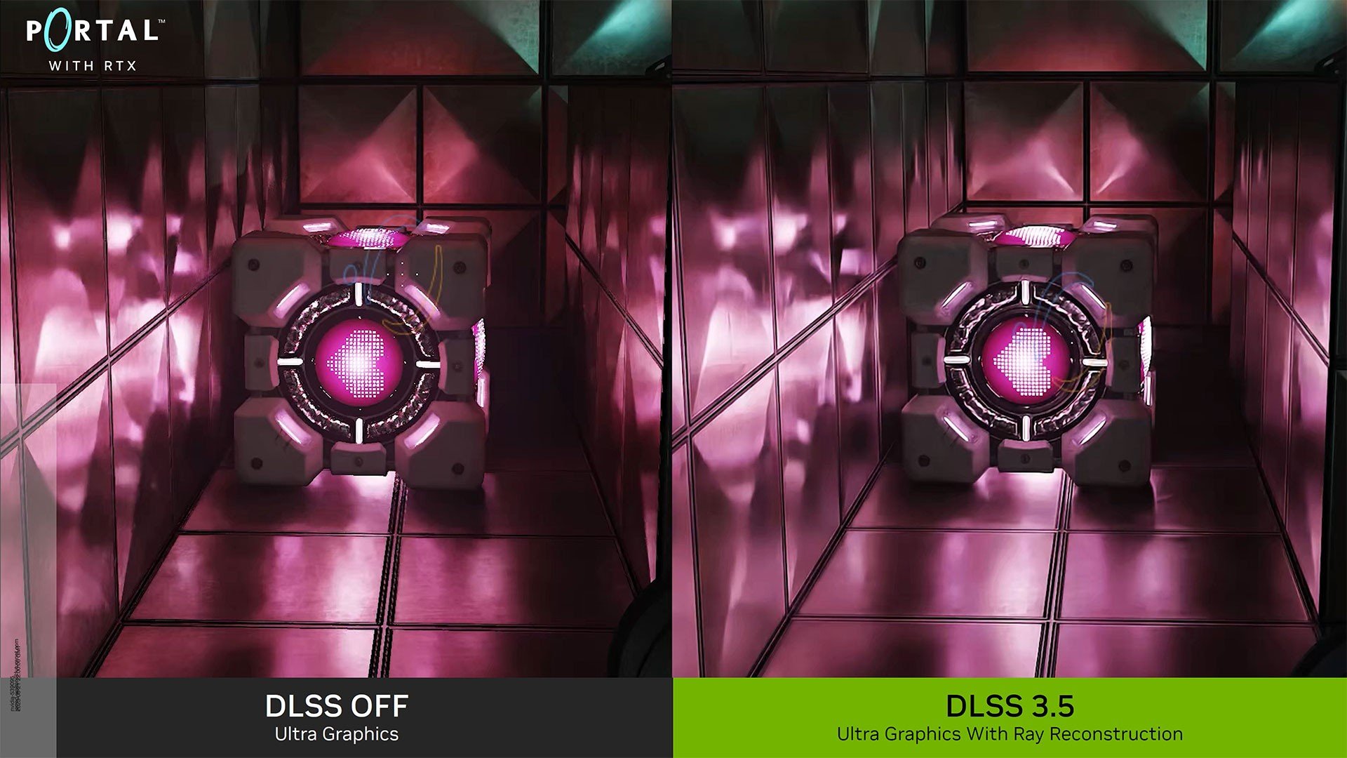 DLSS 3.5 ve “standart” görüntüleri karşılaştırdığınızda Ray Reconstruction adı verilen yeni tekniğin neler sunduğunu anlayabilirsiniz. Portal RTX’teki geliştirilmiş grafikler ise daha az lekelenme ve çok daha yumuşak gradyanlara sahip görünüyor.