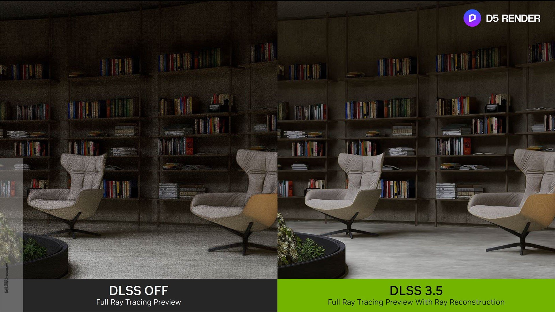 DLSS 3.5’in oyun dışı bir örneği olarak NVIDIA, Ray Reconstruction ve normal olarak tam ışın izleme önizleme modunda çalışan D5 Render’ı gösterdi. Soldaki önizleme benekli ve lekeli görünüyor. DLSS 3.5 ise çok daha kaliteli bir sonucu çok daha hızlı bir şekilde sağlıyor.