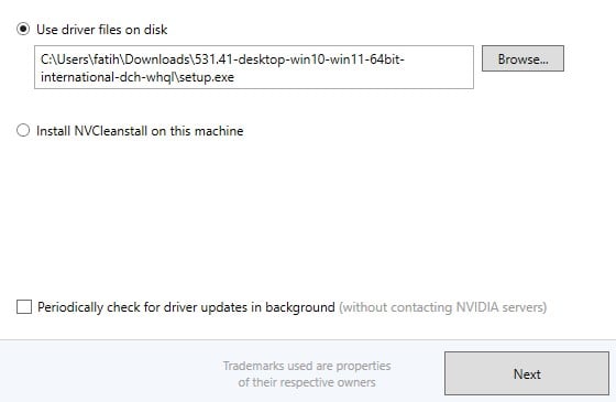 - use driver files from disk‘i seçin ve paketlenmemiş sürücünün setup.exe’sini seçin.