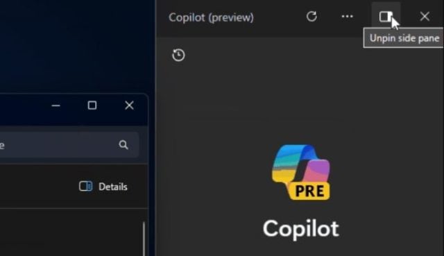 Microsoft ayrıca Windows Copilot üzerinde daha fazla kontrol sahibi olmanızı sağlayacak başka bir özellik daha test ediyor. Yukarıdaki ekran görüntüsünde gösterildiği gibi, yakında bölmenin sabitlemesini kaldırabileceğiz ve diğer uygulamaların AI bölmesinin üstünde açılmasına izin verebileceğiz.