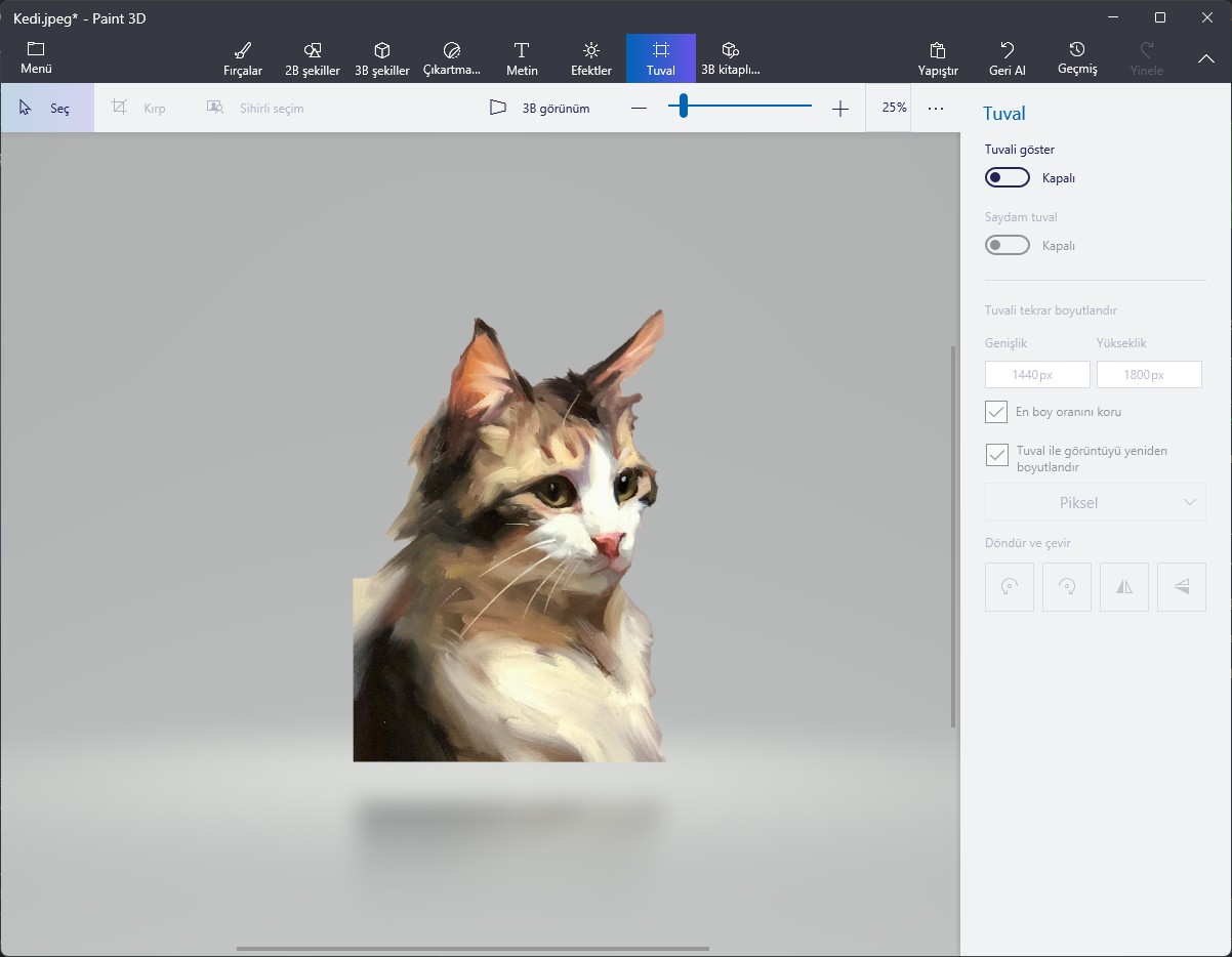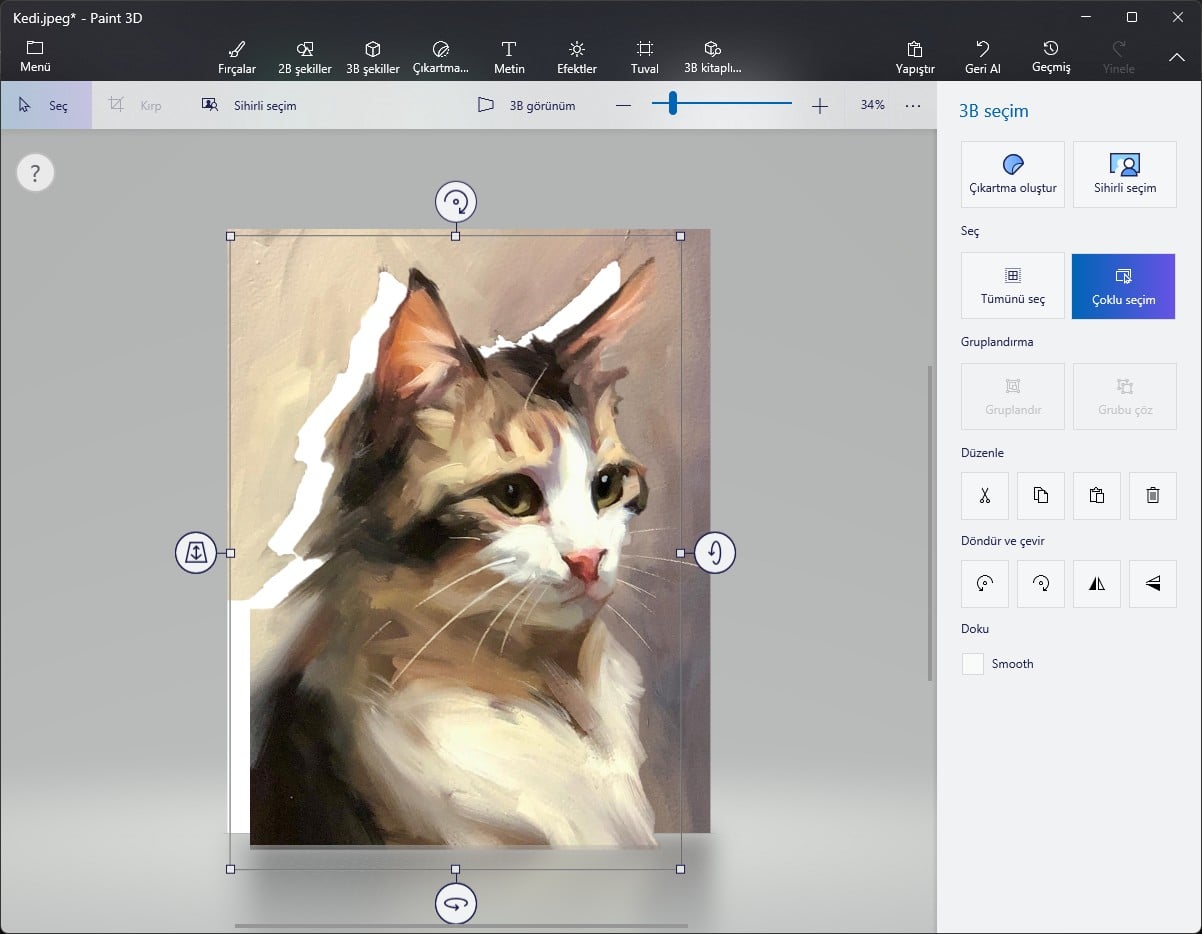 Paint 3D aracındaki süreç önceki Paint uygulamasına göre kolay olmasa da daha fazla seçenek ve kontrol aracı sunuyor.