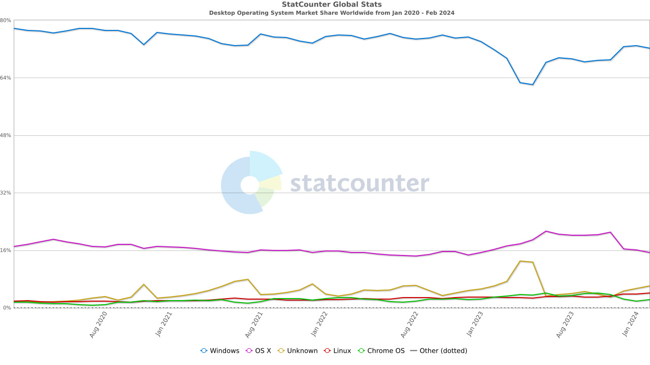 Statcounter’ın raporuna göre masaüstü Linux işletim sisteminin pazar payının ilk kez %4’ün üzerine çıktığı bildiriliyor. Statcounter, Linux pazar payının neden arttığına dair henüz herhangi bir detay paylaşmadı.