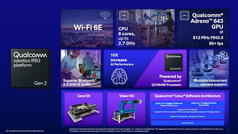 RB3 Gen 2 robot platformunu ise kurumsal ve endüstriyel çözümlere yönelik cihaz içi yapay zekaya sahip. Bu, Qualcomm’un robotik platformunda Qualcomm’un QCS6490 CPU’sunu (8 çekirdekli, 2,7 GHz’e kadar), Adreno 643 GPU’yu, çoklu kamera sensörü desteğini ve entegre Wi-Fi 6E çipini içeren orta seviye bir seçenek olarak karşımıza çıkıyor. Ayrıca Bluetooth 5.2 ve LE ses desteği de mevcut. Geliştirme kitleri bir güç kaynağı, hoparlörler, USB kablosu ve bir geliştirme kartıyla birlikte geliyor. Qualcomm ayrıca montaj braketleri ve Kamera Seri Arayüzü (CSI) kameraları içeren Görüş Kitleri de sunuyor. RB3 Gen 2’nin Haziran ayından itibaren satışa sunulması bekleniyor.