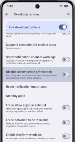 Geliştirici seçeneklerini aktif eden kullanıcılar, isterlerse buradan ekran paylaşımı korumasını devre dışı da bırakabilir. Şimdilik bu özellik Android 15 Beta 1.1 sürümünde gösteriliyor. Aynı özelliğin benzeri “Yayıncı Modu” ismiyle Discord uygulamasında da bulunuyor. Bu sayede yayın esnasında Discord uygulamasında hassas içerikler gizlenebiliyor.