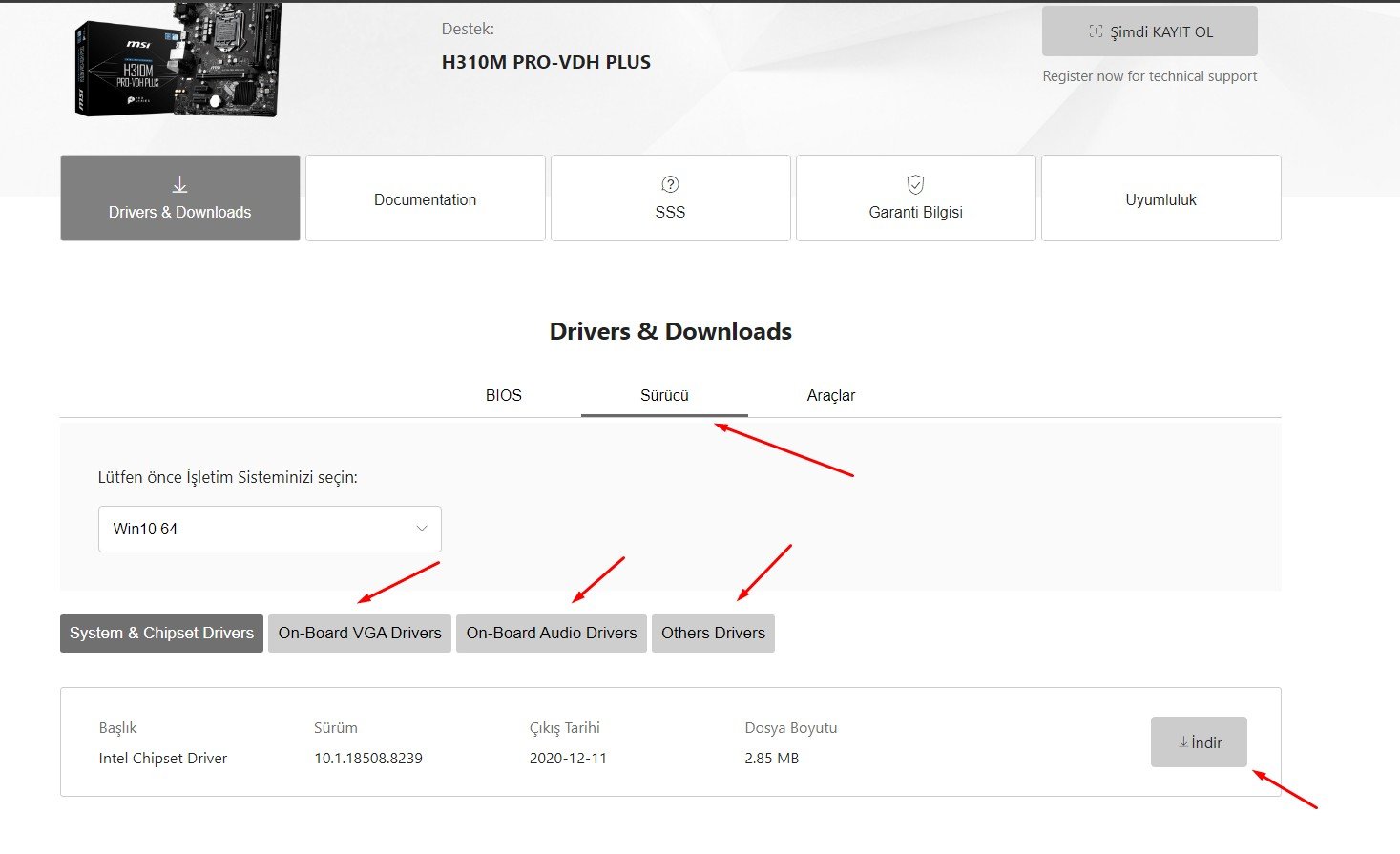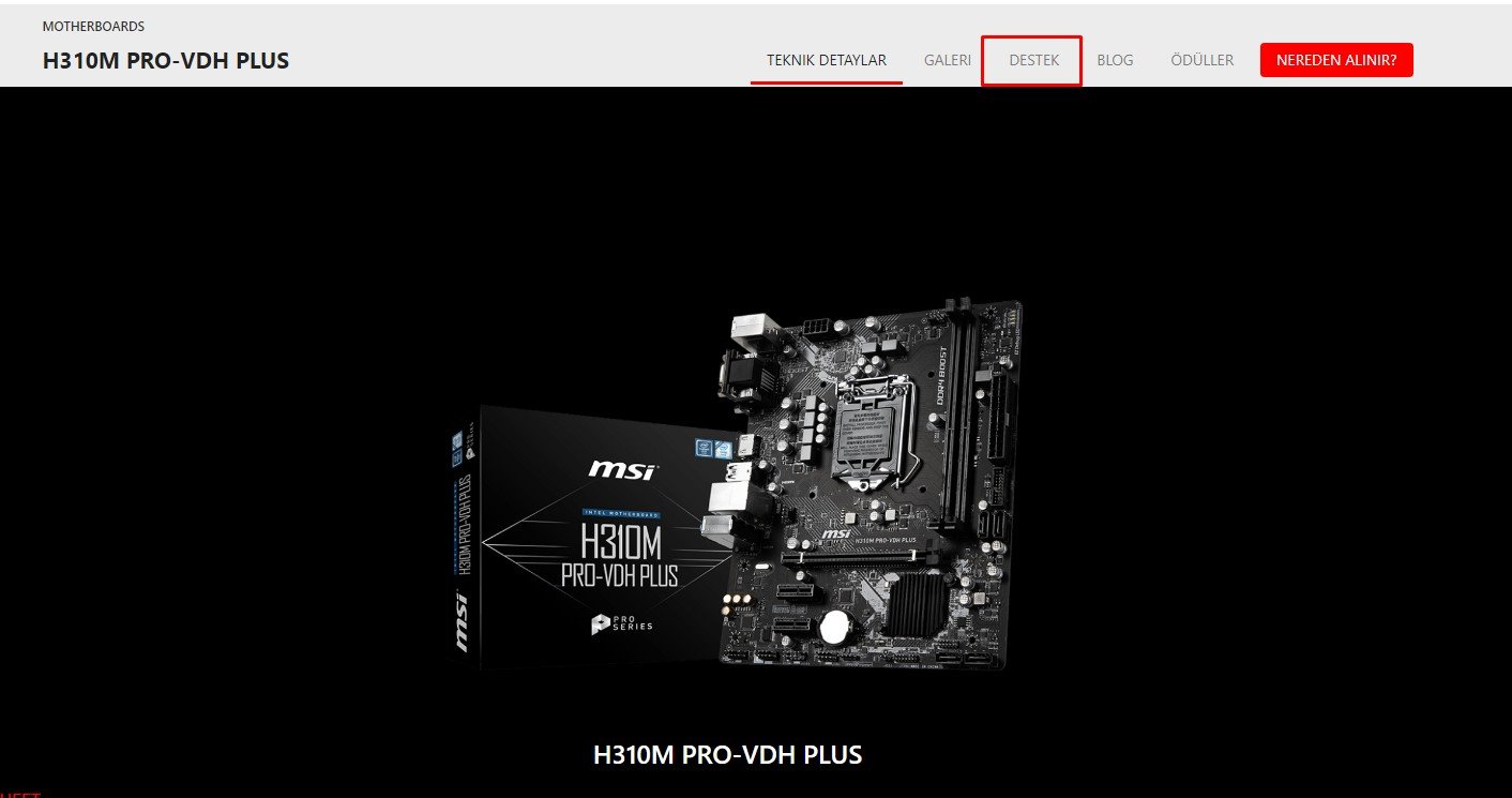 Örneğin benim anakartım MSI H310M PRO-VDH PLUS. Destek sayfasında sizi anakartınız için indirmelerin bir listesine yönlendiren “Destek (Support)” veya “İndirmeler (Downloads)” gibi butonlar göreceksiniz.