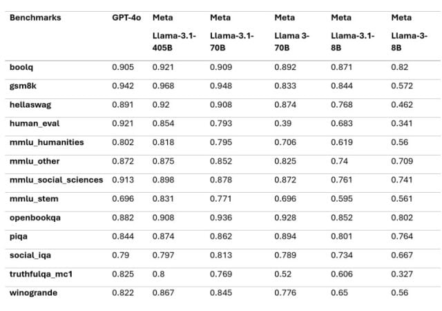 Karşılaştırmalarda gözüktüğü gibi Meta Llama 3.1, aralarında GSM8K, Hellaswag, boolq, MMLU-beşeri bilimler, MMLU-diğer, MMLU-stem ve winograd’ın da bulunduğu çeşitli testlerde GPT-4’ten daha iyi performans gösteriyor. Ancak HumanEval ve MMLU-sosyal bilimlerde geride kalıyor.
