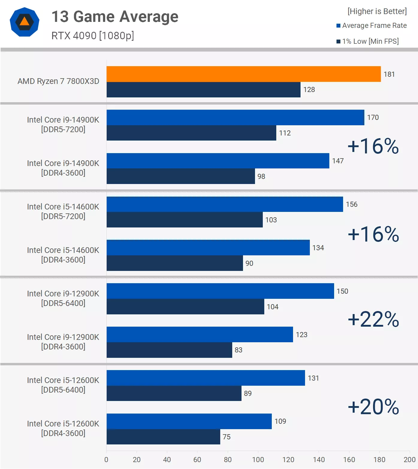 TechSpot, Intel’in 14900K, 14600K, 12900K ve 12600K’yı DDR4-3600 CL14 belleklerle test etti. Diğer yandan tablolardan görebileceğiniz gibi DDR5-7200 ve DDR5-6400 RAM’lerin kullanıldığı farklı testler mevcut.