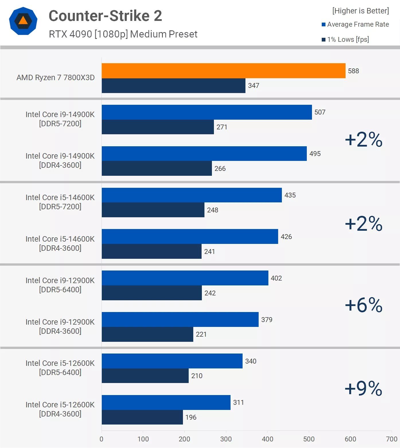 Counter-Strike 2, bellek performansına duyarlı bir oyun değil ve en azından 14. Nesil işlemciyle DDR4 ve DDR5 bellek kullanarak benzer sonuçlar ortaya çıkıyor. DDR5 RAM’e yer verildiğinde i9-12900K ile %6, i5-12600K ile %9 oranında daha iyi sonuçlar elde edilebiliyor.