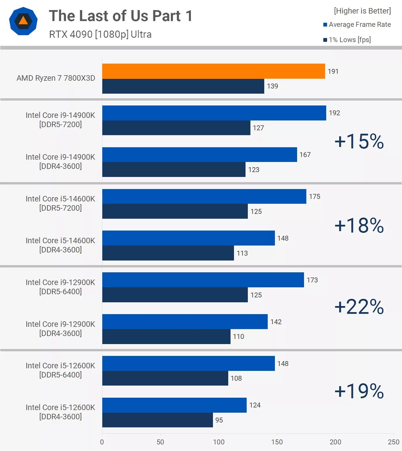 The Last of Us Part 1’e gelince, en küçük performans artışı 14900K testlerinde ve %15 gibi bir performans artışı söz konusu. 14600K’ya geçildiğinde %18 ile fark biraz daha fazla. Alder Lake mimarisine geçtiğimizde, 12900K %22 ve 12600K %19’luk artış gördü. Biraz önce olduğu gibi, 12. Nesil Core serisi yongalar DDR5’in nimetlerinden daha çok faydalanıyor.