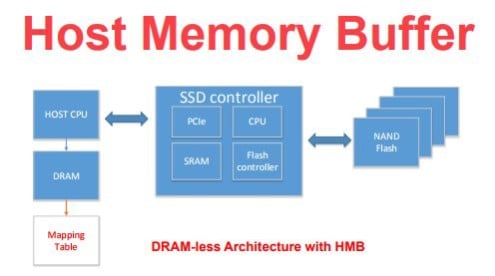 HMB ilk olarak NVMe sürüm 1.3 ile birlikte sunuldu. Şimdi konuyu biraz daha açalım. Bu özellik, dahili DRAM yerine SSD’nin normalde sistem genelinde kullanılan RAM’in bir kısmını kullanılmasına imkan tanıyor. CPU’ya bağı DRAM’i kullanabilmek için PCI Express’in DMA özelliklerinden faydalanılmakta.