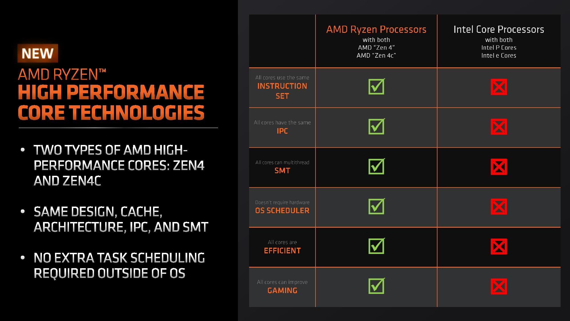 AMD, Zen 4c ile E-Core adı verilen Intel çekirdeklerini karşılaştırmayı reddediyor. Çünkü Zen 4c, standart Zen 4 çekirdeği ile aynı mikro mimariyi paylaşıyor ve sonuç olarak her ikisi de aynı genel özelliklere ve komut setlerine sahip. Buna karşılık Intel’in verimlilik çekirdekleri şirketin performans çekirdeklerinden farklı bir mimari kullanıyor: