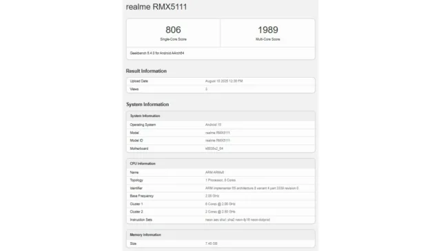 Geekbench 6.4 testine göre Realme 15T, tek çekirdekte 806, çoklu çekirdekte ise 1.989 puan aldı. Cihazın MediaTek’in Dimensity 6400 Max yonga setinden güç aldığı ve test edilen prototipte 8 GB RAM ile çalıştığı kaydedildi. Final sürümde farklı RAM seçeneklerinin sunulması da muhtemel görünüyor.