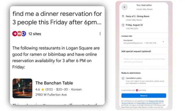 Örneğin restoran rezervasyonu yapmak isteyen bir kullanıcı tek bir sorguyla rezervasyon platformlarını dolaşmak zorunda kalmadan doğrudan sonuç alabiliyor. Google, OpenTable, Resy, Tock gibi rezervasyon servisleriyle iş birliği yaparak gerçek zamanlı uygunluk bilgilerini topluyor ve kullanıcıya seçilebilir liste halinde sunuyor.