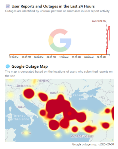 Google servisleri Türkiye saatiyle 11:10 itibarıyla geniş çaplı bir kesintiyle karşı karşıya kaldı. Sorun özellikle Balkanlar ve Karadeniz bölgesinde yoğun şekilde hissedildi. Peki nereler etkilendi?