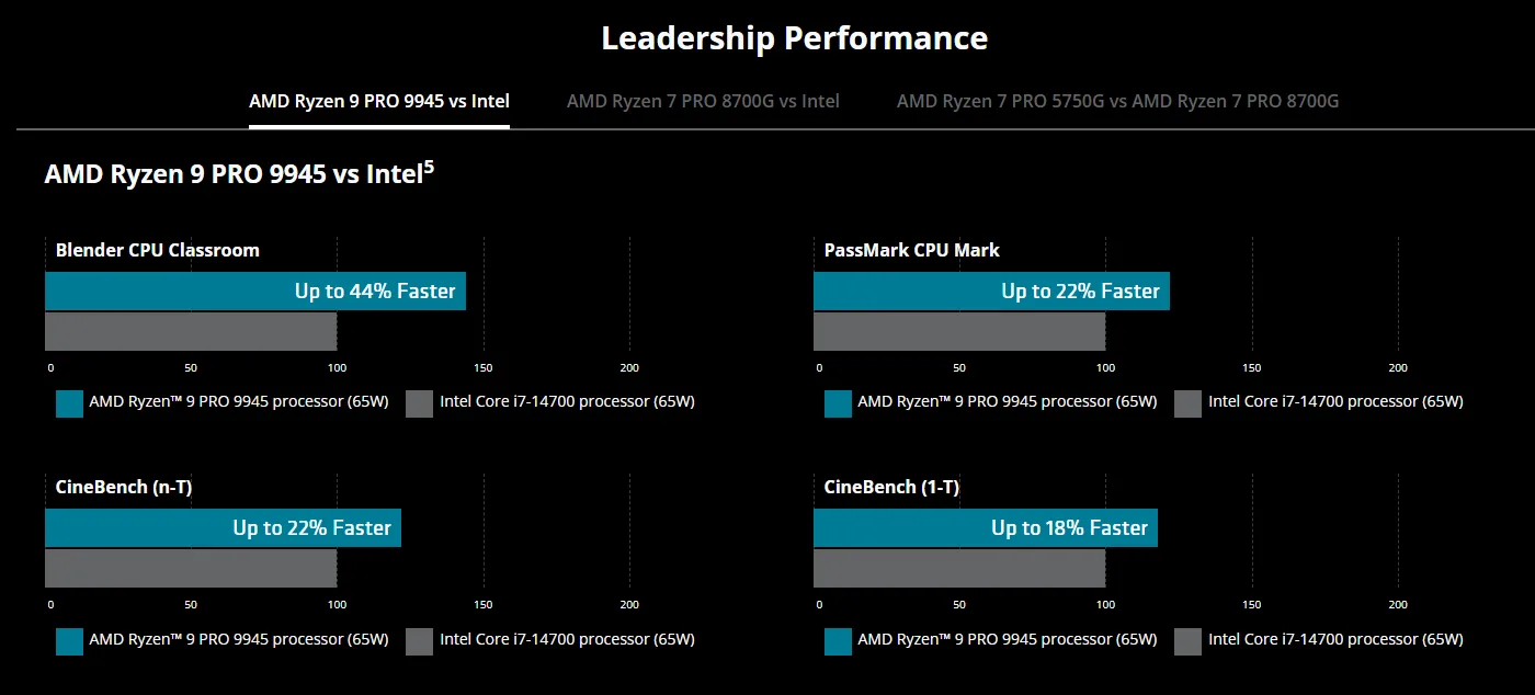 Yeni serinin amiral gemisi Ryzen 9 PRO 9945, 12 çekirdek ve 24 iş parçacığına sahip yapısıyla öne çıkıyor. 3,4 GHz taban frekansı ve 5,4 GHz’e kadar çıkan boost hızıyla gelen işlemci, 76 MB önbellek ve 65W TDP değerine sahip. Yapılan testlerde Intel Core i7-14700’e kıyasla Blender CPU Classroom senaryosunda yüzde 44’e, PassMark CPU Mark testinde yüzde 22’ye, Cinebench n-T testinde yüzde 22’ye ve Cinebench 1T testinde ise yüzde 18’e kadar daha yüksek performans sunduğu ölçüldü.