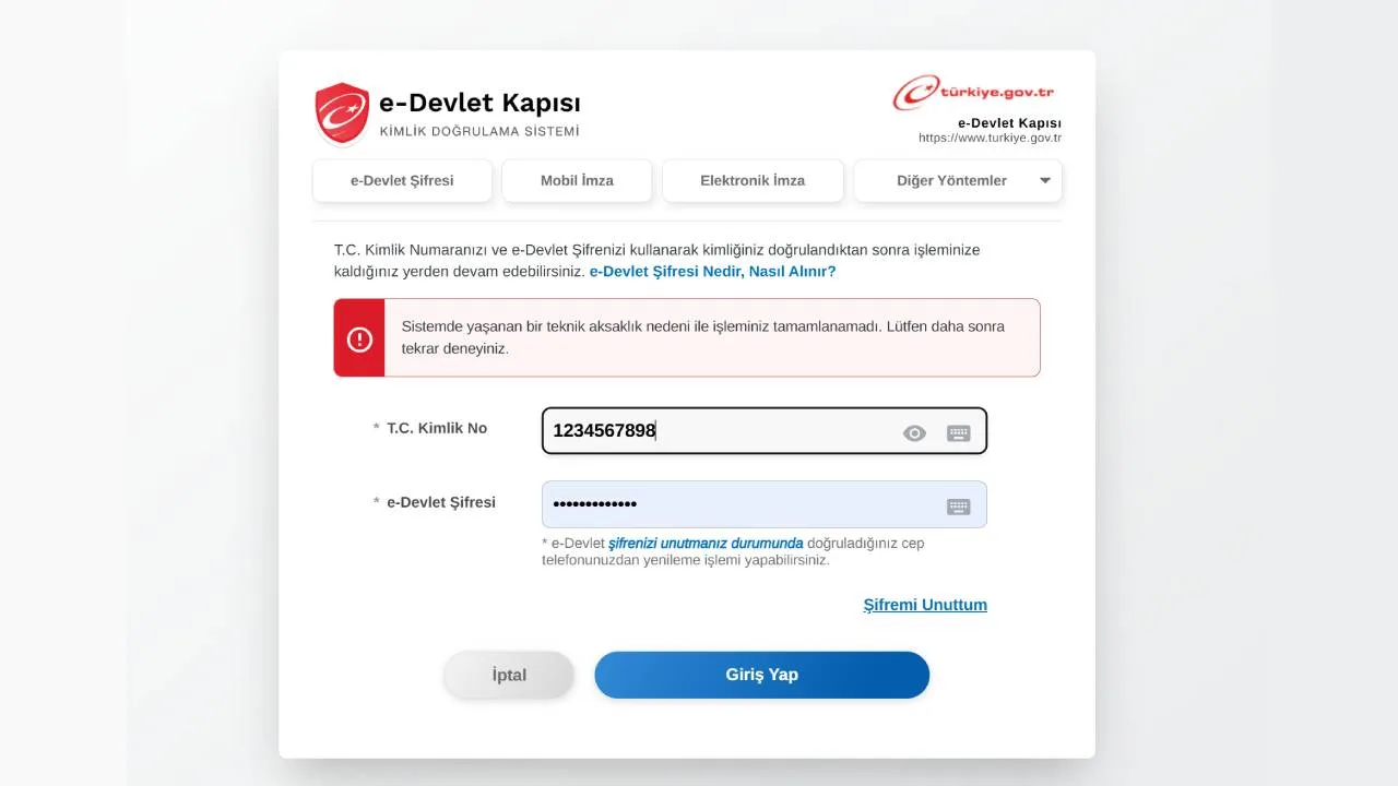 Söz konusu hata hem şifreli girişlerde hem de diğer kimlik doğrulama yöntemlerinde ortaya çıkıyor. Birçok kullanıcı özellikle sabah saatlerinden itibaren platforma erişemediğini sosyal medya üzerinden dile getirmeye başladı. Paylaşımlarda giriş ekranında kimlik numarası ve şifre doğru girilmesine rağmen sistemin oturum açmayı reddettiği belirtiliyor.