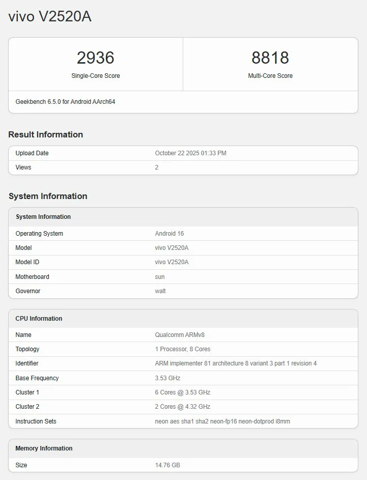 iQOO Neo 11, V2520A model numarasıyla Geekbench veri tabanında göründü. Performans testi sonuçlarına göre telefon Qualcomm’un Snapdragon 8 Elite yonga setinden güç alacak. Test sonuçlarında tek çekirdekte 2.936, çoklu çekirdekte ise 8.818 puan elde edildiğini görüyoruz.