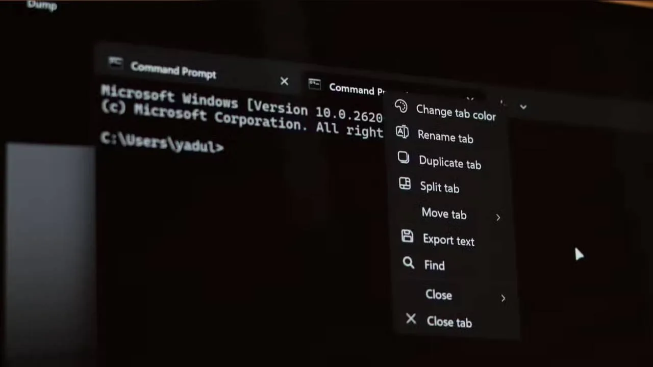 Yeni Terminal sürümünde sekmelere veya pencerelere sağ tıklandığında açılan menü tamamen yenilendi. Artık sekmeleri bölmek, taşımak, yeniden adlandırmak, renk atamak veya kapatmak gibi işlemler doğrudan bu menü üzerinden yapılabiliyor. Terminal penceresi içinde sağ tıklayarak metin yapıştırmak, belirli kelimeleri aramak veya terminal içeriğini dışa aktarmak da mümkün hale geldi.