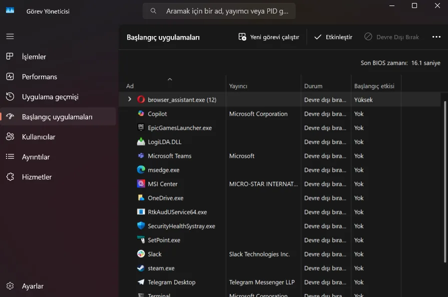 Birçok yazılım kurulum sırasında kendisini sistem başlangıcına ekler. Bu da bilgisayarın açılış süresini uzatır. Görev Yöneticisi’ni (Ctrl + Shift + Esc) açıp Başlangıç sekmesinden gereksiz programları devre dışı bırakın. Tarayıcı eklentileri, güncelleme hizmetleri veya medya oynatıcılar genellikle burada yer alır.