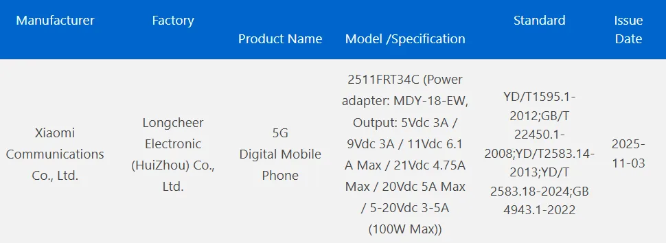 Redmi Turbo 5, 2511FRT34C model numarasıyla 3C veri tabanında göründü. Bu gelişme akıllı telefonun 100W’a kadar hızlı şarj desteği sunacağını doğruluyor. Fakat diğer teknik özelliklerine dair herhangi bir detay maalesef yok.