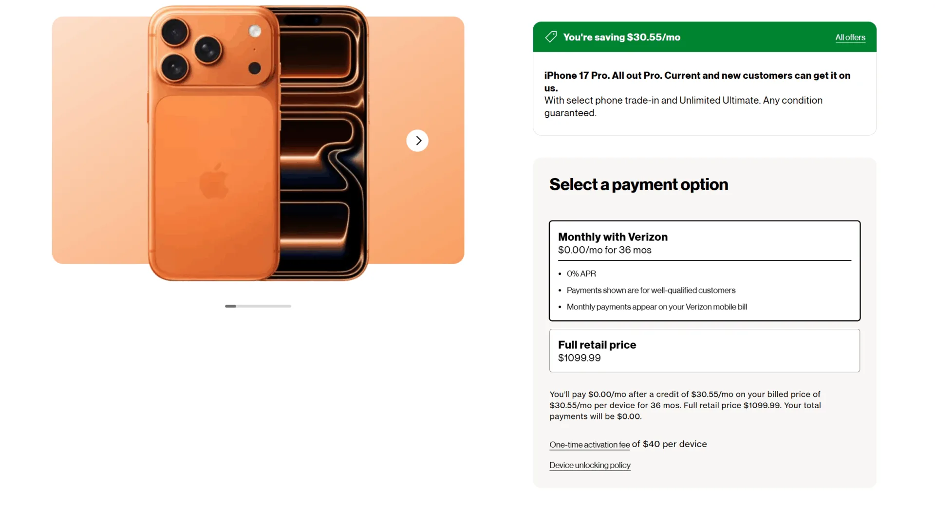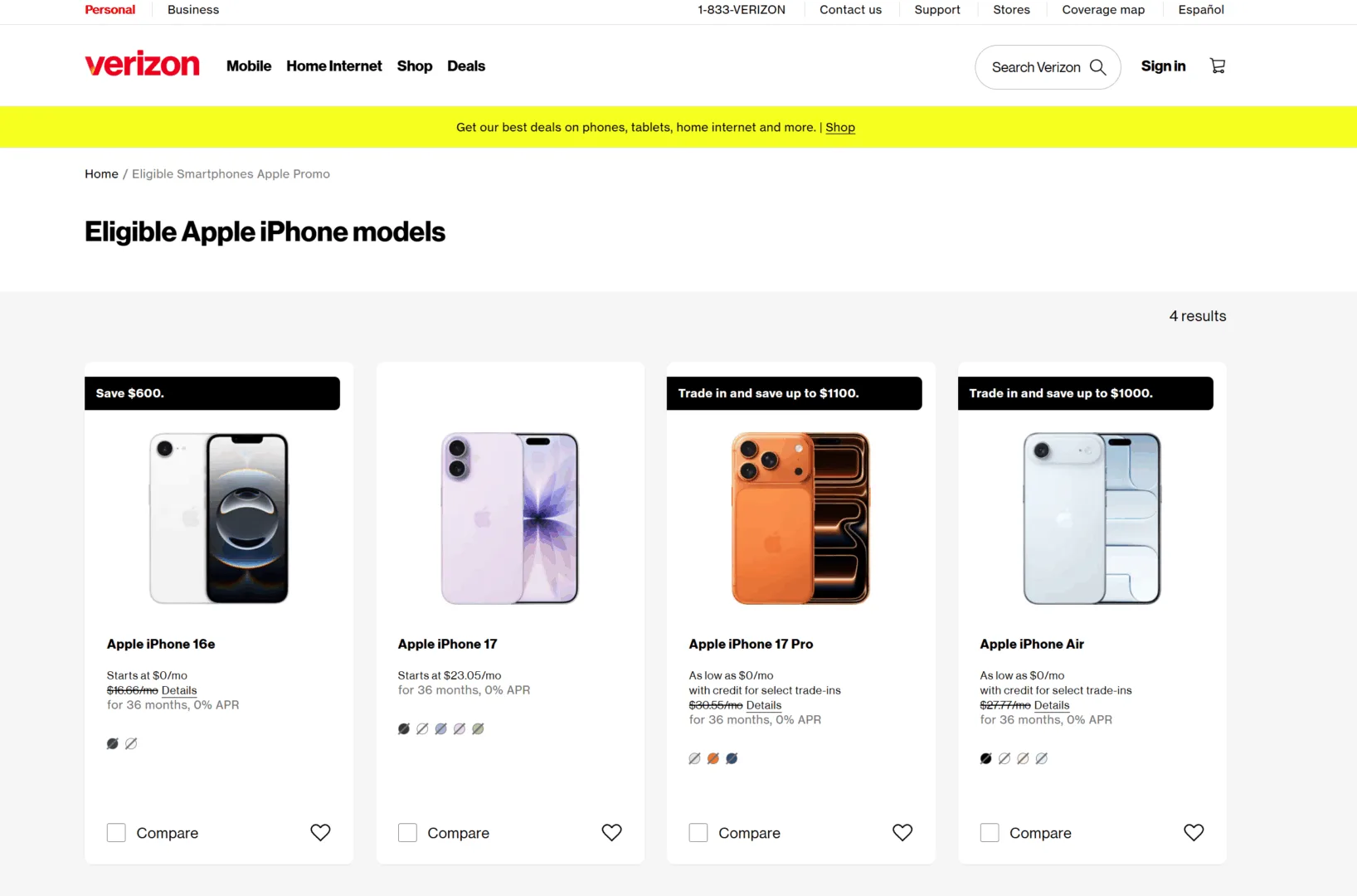 iPhone 17’nin 256 GB ve 512 GB depolama seçenekleriyle satışta olduğu görülüyor. Renk seçenekleri arasında lavanta, beyaz, siyah, mavi ve yeşil yer alıyor. iPhone 17’nin Verizon’daki perakende satış fiyatı 829 dolar, iPhone 17 Pro’nun fiyatı ise 1.099 dolar olarak listelenmiş durumda. Kampanya kapsamında her iki model de aylık ödemesiz şekilde alınabiliyor. Ek olarak birçok Samsung modelinin de benzer kampanyalarla verildiğini görüyoruz.