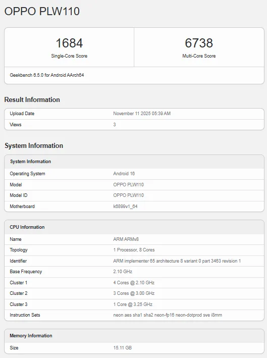 OPPO Reno 15 PLW110 model numarasıyla Geekbench platformunda listelendi. Akıllı telefon yapılan tek çekirdekli testlerden 1684 ve çok çekirdekli testlerden ise 6.738 puan almayı başardı.