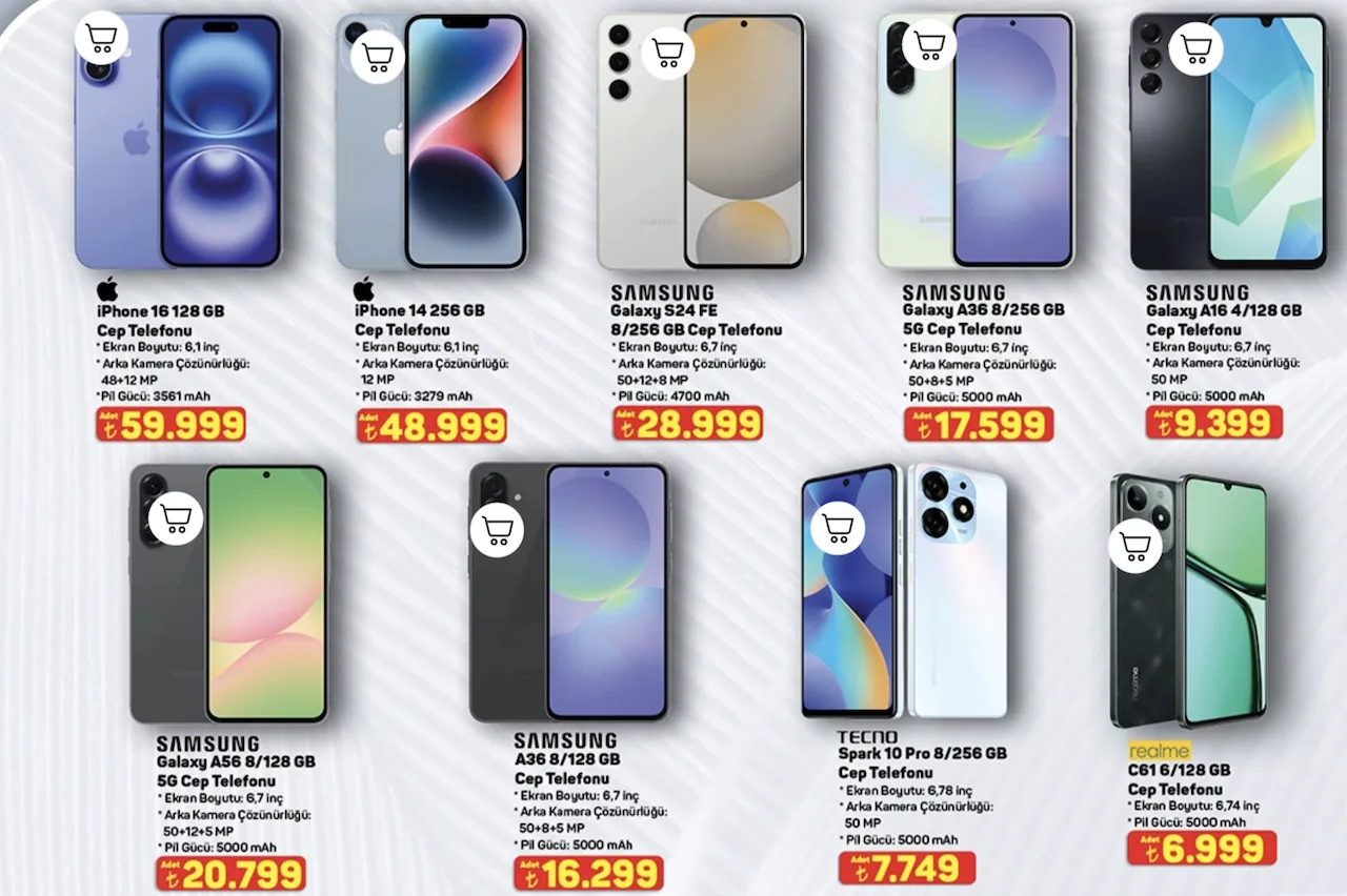 Sadece bunlarla sınırlı değil. Samsung Galaxy S24 FE, 8 GB RAM ve 256 GB depolama alanına sahip versiyonuyla 28.999 TL fiyat etiketi taşıyor. Bununla birlikte 8 GB RAM + 256 GB depolama sunan Galaxy A36 5G 17.599 TL, 4 GB RAM + 128 GB depolamalı Galaxy A16 9.399 TL ve 8 GB RAM + 128 GB depolama sunan Galaxy A56 ise 20.799 TL’den satışa sunuluyor.