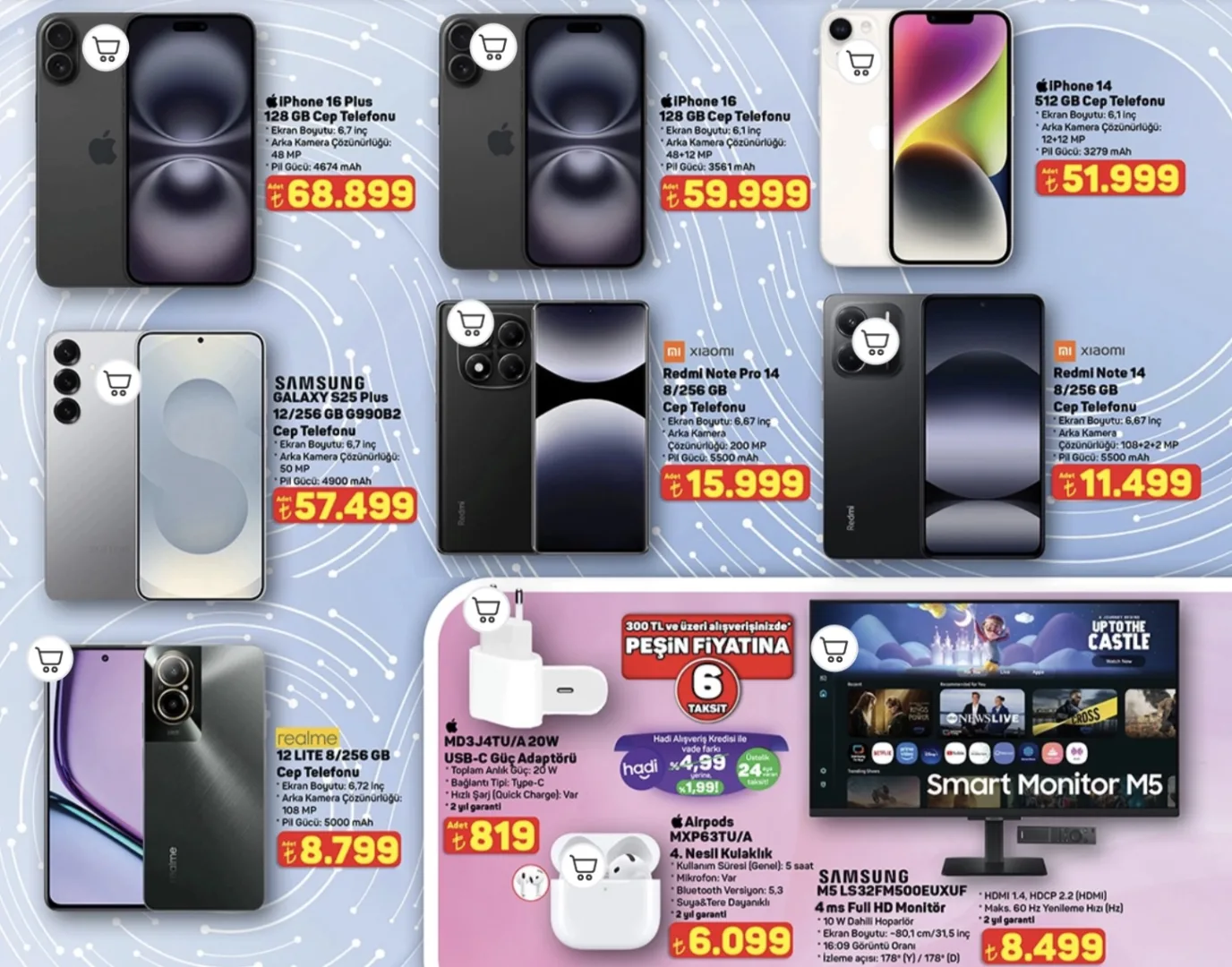 Sadece bunlarla sınırlı değil. 512 GB depolamalı iPhone 14 modeli 51.999 TL fiyat etiketi taşıyor. Bununla birlikte 12 GB RAM + 256 GB depolama sunan Galaxy S25 Plus 57.499 TL, 8 GB RAM + 256 GB depolamalı Redmi Note Pro 14 15.999 TL ve 8 GB RAM + 256 GB depolama sunan realme 12 Lite ise 8.799 TL’den satışa sunuluyor.