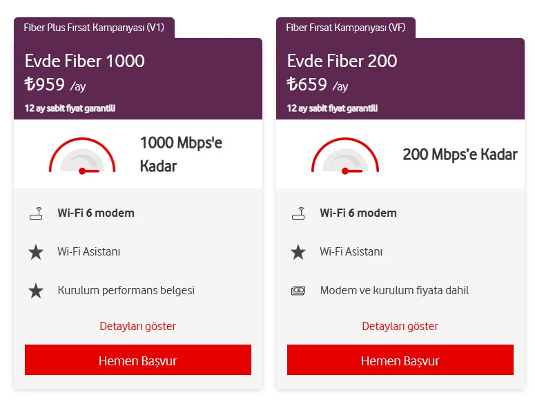 Son olarak XGSPON ile 10 gigabite kadar hızlara çıkmak mümkün. Üstelik Vodafone burada tamamen simetrik hızlar olduğunu söylüyor. Ancak ev interneti alacak kişiler için yalnızca aşağıdaki görselde fiyatlarını görebileceğiniz iki paket bulunuyor.