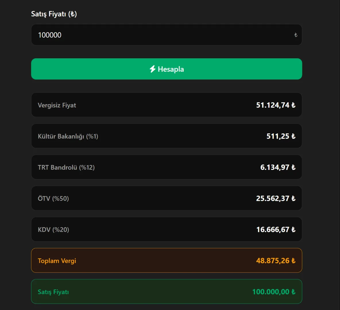 Paylaşılan hesaplama ekranında görüldüğü üzere, Kültür ve Turizm Bakanlığı payı şu an vergisiz fiyat üzerinden yüzde 1 olarak alınıyor. Yeni düzenleme yürürlüğe girdiğinde bu oran yüzde 1,2’ye yükselecek ve toplam vergi yükü içindeki payı da artacak. Telefonlarda halihazırda TRT bandrolü, ÖTV ve KDV ile birlikte toplam vergi oranı yüzde 100’ün üzerine çıkmış durumda.