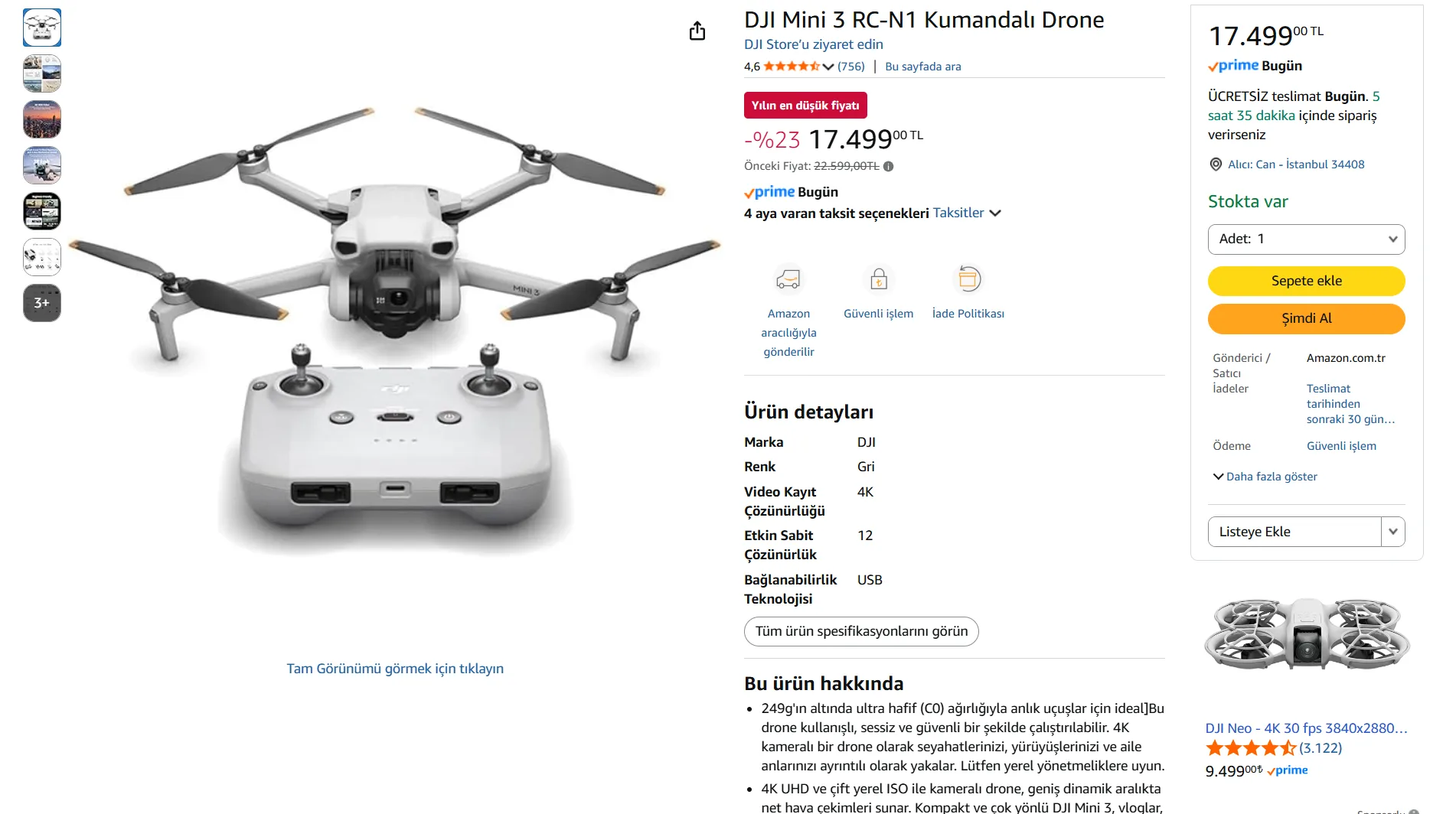 DJI Mini 3 RC-N1 modeli Amazon Türkiye’de Prime avantajı ile 17.499 TL fiyat etiketiyle satışa sunuldu. Aynı ürün n11, Hepsiburada, İdefix ve diğer pazaryerlerinde 21.000 TL ile 22.000 TL aralığında listelenmeye devam ediyor. Bu tabloya bakıldığında Amazon’daki fiyat an itibariyle piyasanın en düşüğü. Fiyat farkı doğrudan karşılaştırıldığında yaklaşık yüzde 20’nin üzerinde bir düşüş görüyoruz.