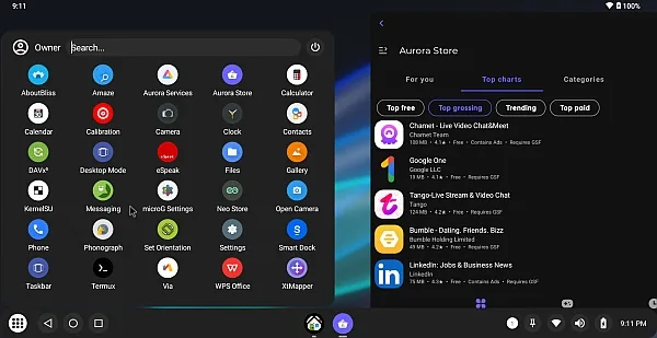Bliss OS klavye ve fare kullanımına uygun arayüzüyle dikkat çekiyor. Google Play Store yüklü olarak geliyor ve Android uygulamaları tam ekran veya pencere modunda çalıştırılabiliyor.
