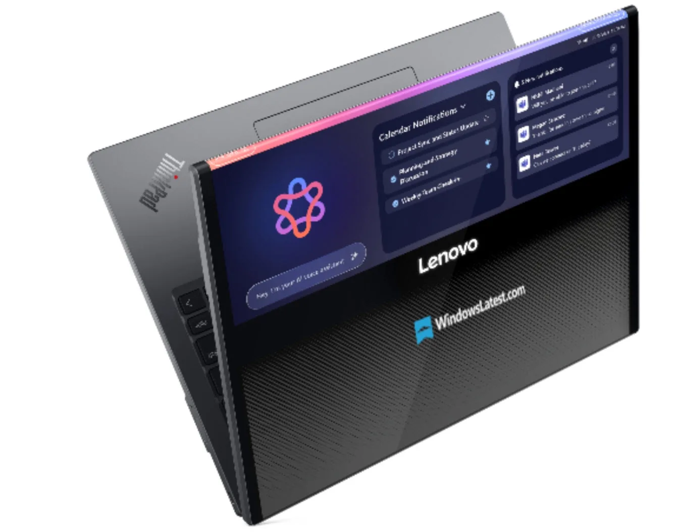 Bu dışa bakan bölümde; takvim hatırlatmaları, AI sohbet botu yanıtları ve bağlamsal bildirimler yer alabiliyor. Böylece cihaz, pasif bir kapalı dizüstü olmaktan çıkıp her an bilgi sunabilen bir yüzeye dönüşüyor. Aynı zamanda bu yaklaşım, Lenovo’nun bağlamsal akıllı cihaz vizyonunun ilk somut örneklerinden biri olarak görülüyor.