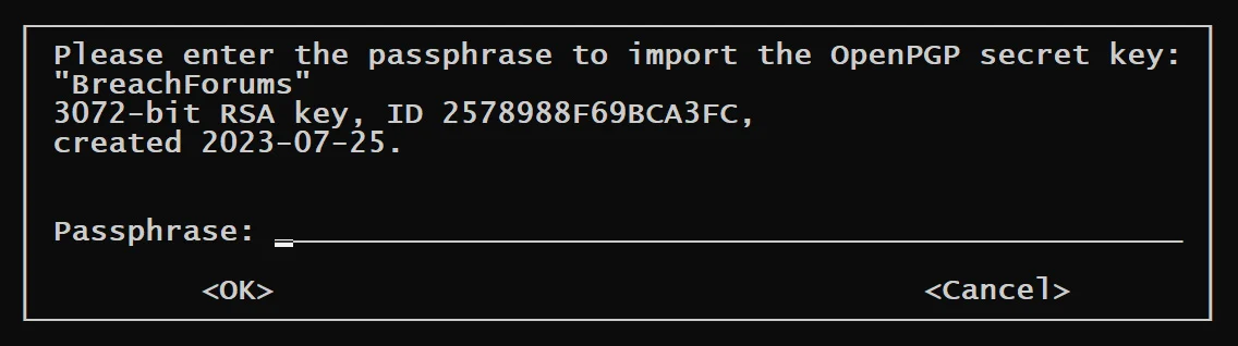 PGP anahtar dosyasının, 25 Temmuz 2023 tarihinde oluşturulduğu ve BreachForums yöneticilerinin resmi mesajlarını imzalamak için kullandığı özel anahtara ait olduğu bilgisi paylaşıldı. Bu anahtarın parola ile korunduğu, parolanın bilinmemesi durumunda kötüye kullanım riskinin bulunmadığı belirtiliyor.